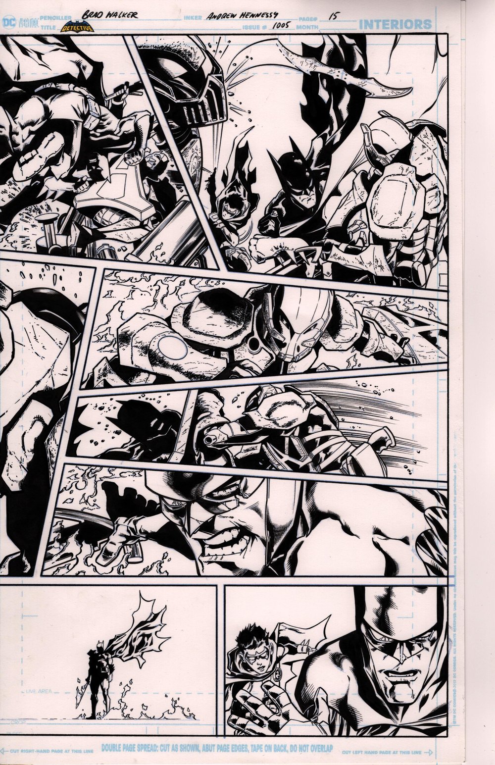 Original art for DC Comics' DETECTIVE COMICS (2016), issue 1005, Pages 14 and 15. Double page spread in pen and ink art. Original pencils by Brad Walker with Andrew Hennessy inks. Featuring BATMAN, ROBIN, and the ARKHAM KNIGHT!